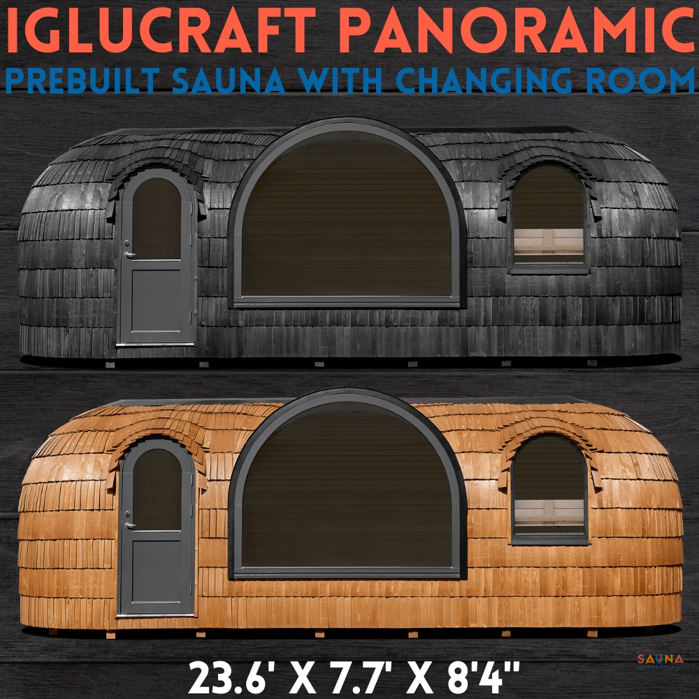 Fully assembled two-room outdoor sauna with a fixed panoramic window. Triple‑layer spruce exterior and aspen interior; seats up to six. Choose wood‑fired or electric heat. Flatbed delivery (customer off‑loading).