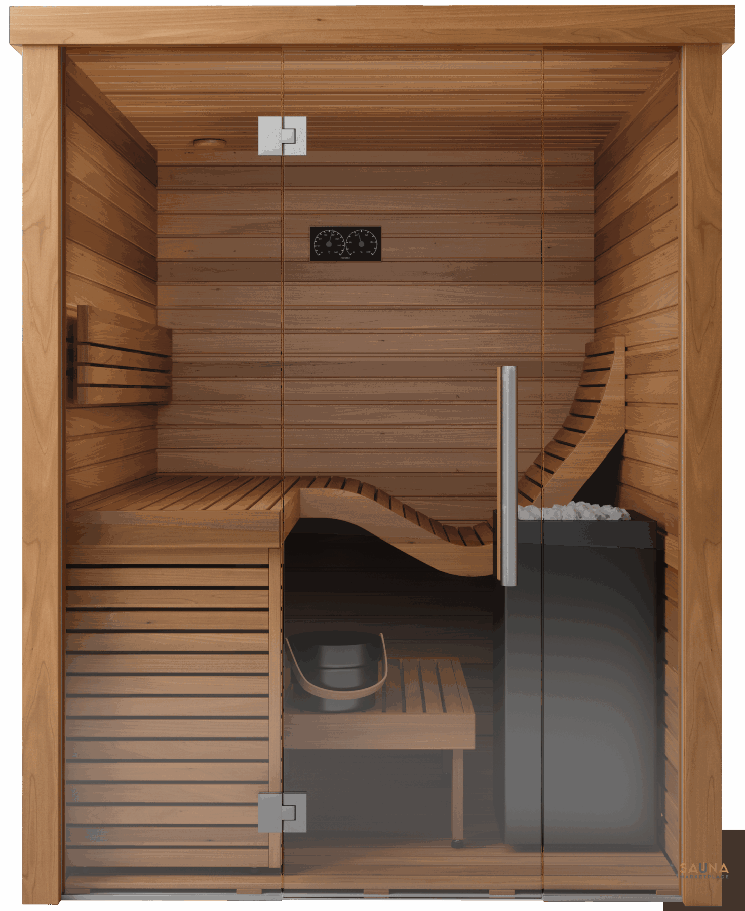 When Purchased on Sauna Marketplace, the Auroom Baia Sauna Kit includes: previously assembled wall elements (8), base elements (5), corner posts (4), corner mouldings (4), ceiling elements (2), cladding on 2 side walls, bench supports, upper bench frame, ergonomic bench, lightshade, backrest mounting blocks, backrest with LED light, bench grids, door frame (can be installed to open right or left), tempered door glass (8mm thick), metal-wood door handle, metal hinges, heater guard, floor grid, finishing mouldings, accessories: bucket, ladle, thermometer, hygrometer, sand timer, aroma set, sauna hat, sauna pillow, US-Based Support.