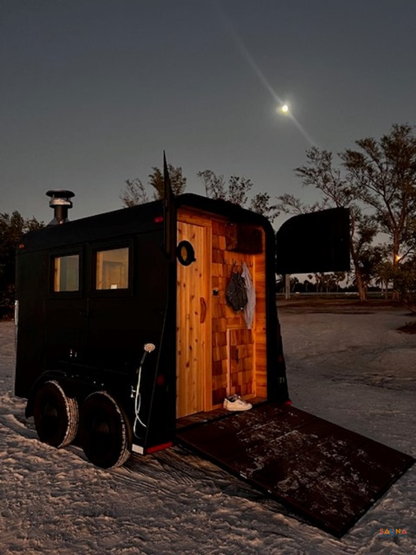 – Horse box trailer sauna with cedar‑lined cabin and benches