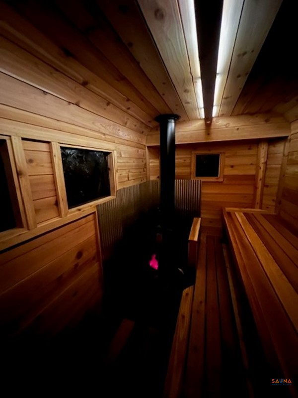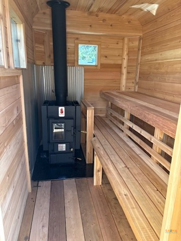 – Cedar cabin comfort: Interior lined with fragrant Western Red Cedar and fitted with upper and lower benches. Top bench is 24 in deep and 44 in below the ceiling, seating 5+ adults comfortably.