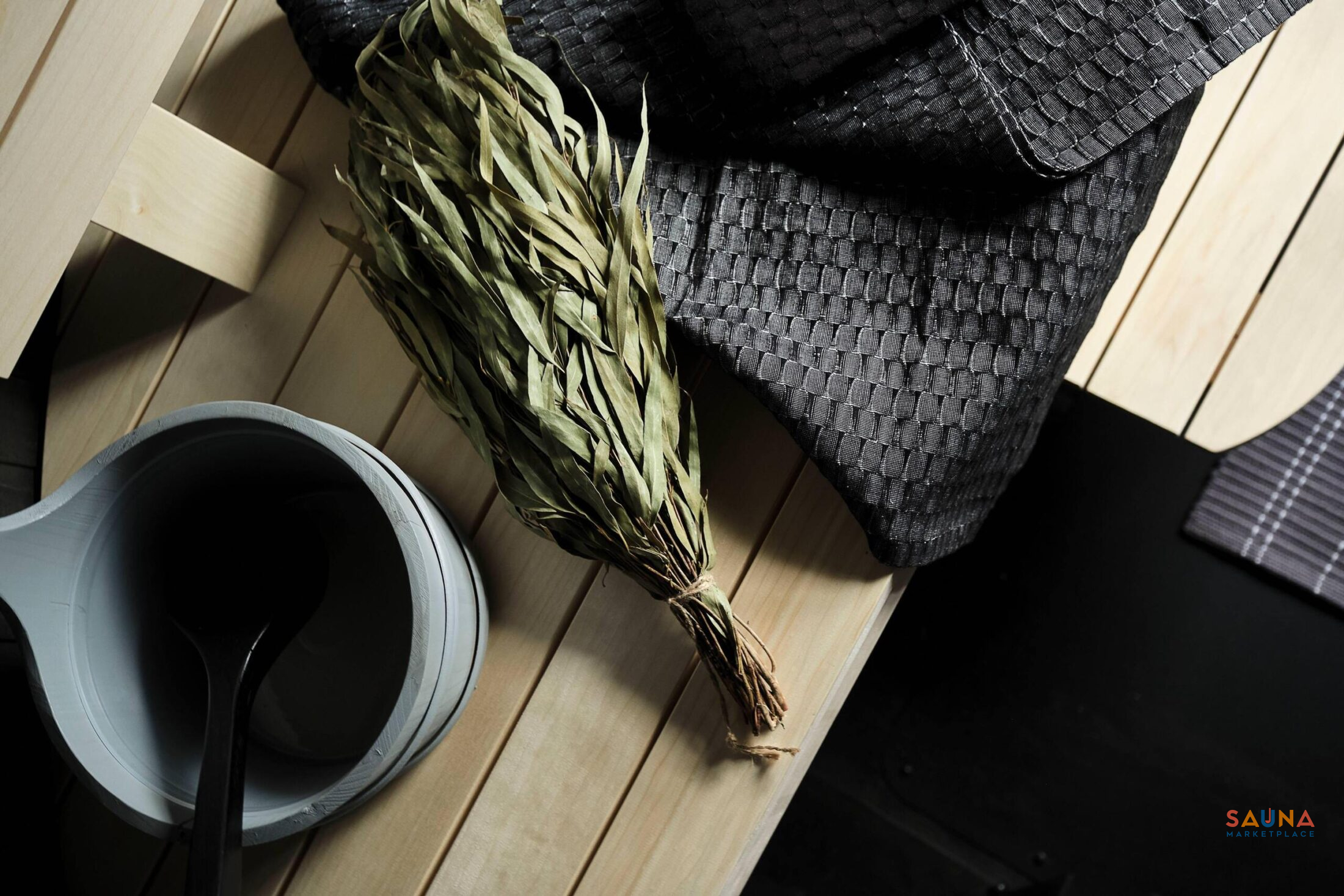 Smoke Sauna Black: charcoal walls with pale benches—intimate and meditative