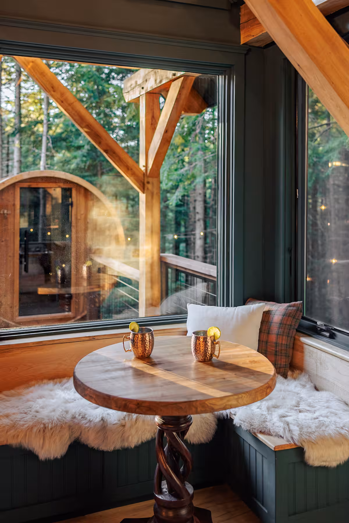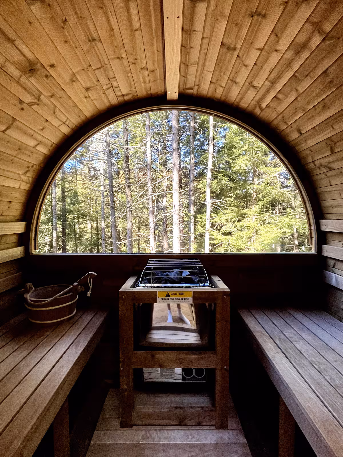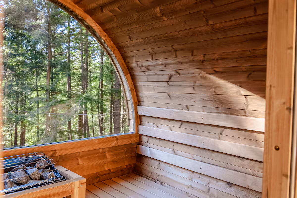 The Thermory Barrel Sauna Kit features a glass door and optional panoramic window, filling the space with natural light and providing a serene ambiance. Inside, you'll find comfortable benches for an exceptional relaxation experience.